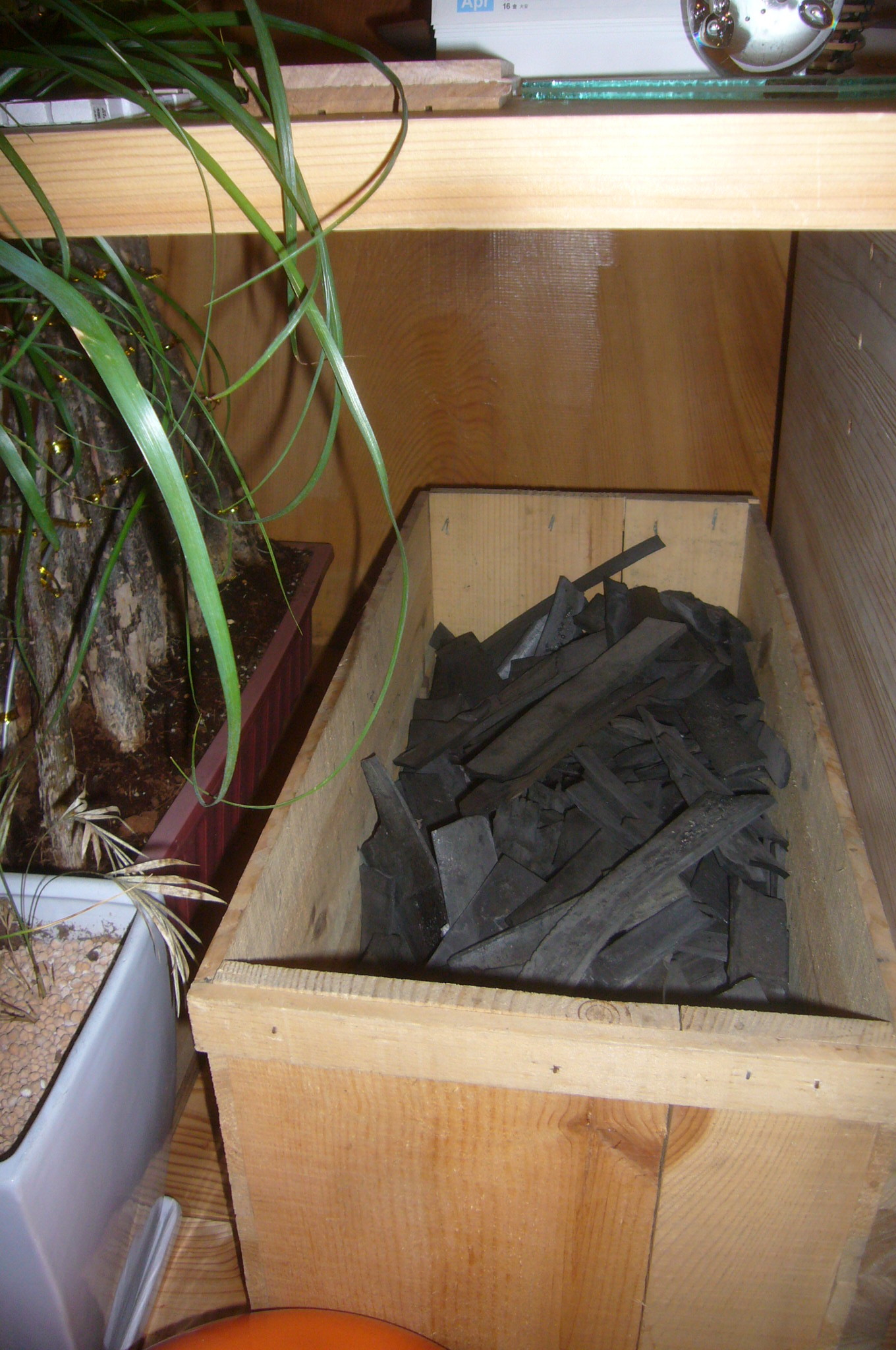 竹炭をりんご箱に入れて1F事務所に置いて実践中